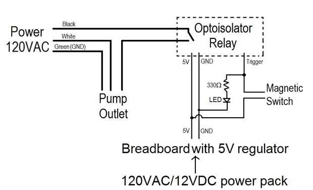El esquema muestra todas las conexiones. El gatillo desde el inodoro consiste en los dos cables del sensor magnético va a la placa y conectar a 5V y el disparo del relé. Cuando el sensor magnético se cierra mientras el flotador está abajo en un tocador rasante, se activa el relé para conectar a 120V a la bomba para encenderla. El LED está encendido mientras la bomba está funcionando así que usted puede comprobar que la electrónica está trabajando.