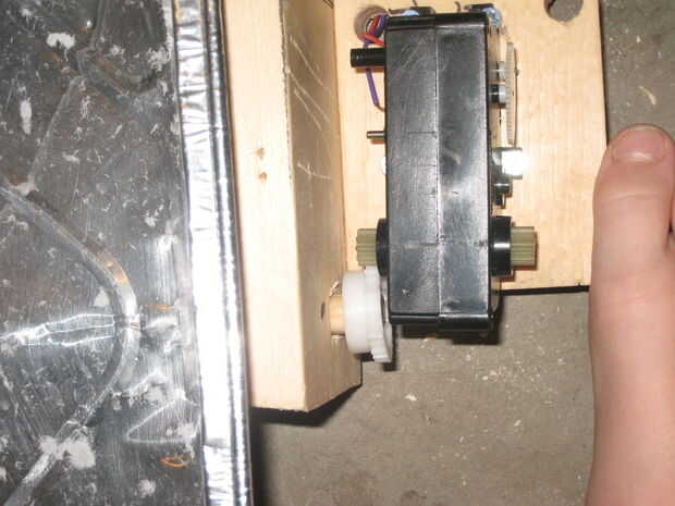 Ahora tiene que montar la caja de cambios. Tuve que mina de montaje en ángulo recto a la Junta que el equipo estaba al lado. (Recuerde que el equipo tiene que estar en el exterior.) Así que corte un Consejo que pude montar la caja de engranajes a, mientras que los engranajes estaban todavía mallado. Básicamente, encontrar una manera de montar la caja de cambios a algo por lo que puede del acoplamiento con el engranaje en la espiga. La finalidad básica de esta es roca ida y vuelta (tostador de pavo) para que algunas piezas más pesadas se hunden hasta el fondo como clips y luego incluso el papel cuando se va hacia la siguiente zona. Basta con mirar las fotos.