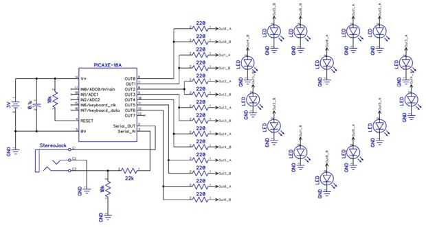 El circuito esquemático es mostrado arriba; nada fuera de lo común. El circuito funciona de dos baterías recargables. Las corrientes hacia los LEDs son lo suficientemente bajas como para que el microcontrolador puede conducirlos directamente. El pulsador que se muestra en el circuito real terminó por no acostumbrarse por lo que había omitido en el esquema. El Picaxe tiene un gestor de arranque instalado y programado a través de una sencilla interfaz serial - dos resistores y un jack estéreo de 3,5 mm es todo lo que necesita para eso.