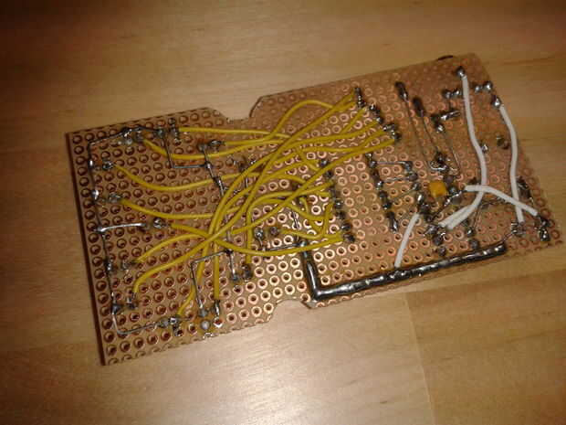 Construimos el circuito en una placa de prototipo estándar. Era la primera vez que mi hijo hizo alguna soldadura (bajo supervisión muy cercana por mí mismo para estar seguro), él estaba muy emocionado. Arriba puedes ver el resultado final.