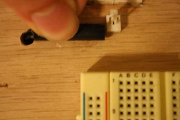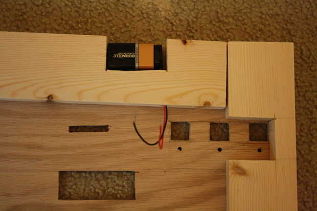 7. taladrar un agujero de aproximadamente una pulgada a la izquierda de donde va a ser la cabecera de 9V. Aquí es donde los cables del sensor del imán que se a través (véase cuadro 3).