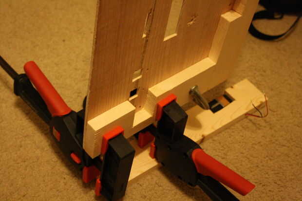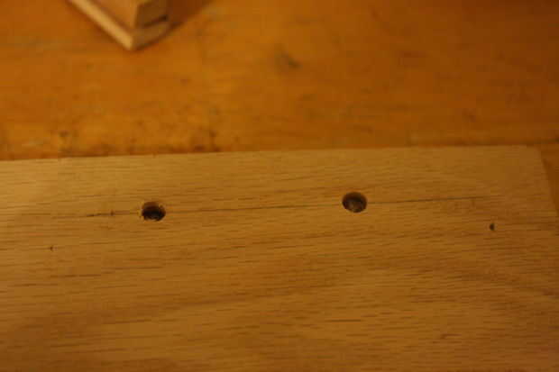 8. Finalmente, haga dos orificios en la esquina superior derecha de la base. Estos serán para los LEDs que iluminan la exhibición de acrílico. Puede esperar para perforar estos agujeros hasta después de la sección inferior de la base se pega en.