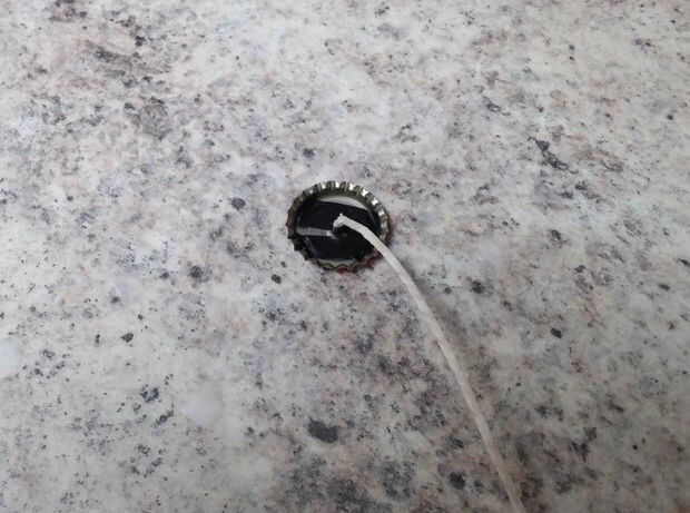 En velas normales, la ficha de mecha es comúnmente caliente pegado a la parte inferior de la jarra para mantenerlo en su lugar. En cambio, os adjunto las fichas de mecha para tapas de botellas no utilizadas. Al principio, usé la última de mi pegamento caliente para fijar las lengüetas de la mecha a los tapones de botellas. Después de que funcionó hacia fuera, comencé a colocar las lengüetas con cinta aislante. La cinta eléctrica funcionó muy bien ya que se extiende sobre la parte superior de la botella.