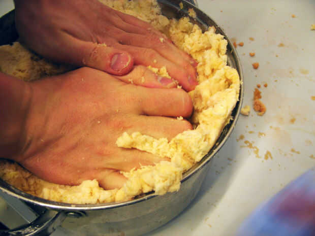 Mezclar bien 1/2 a 1 cucharadita de sal y la fécula de patata que acaba de guardar con la masa de Papa seca. La masa poder absolutamente molde-en este punto. El peso de la masa que debe tener ahora debe ser camino, vía inferior a la cantidad original de patatas con que comenzó.