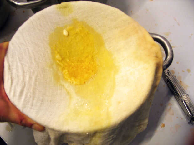 Después de que ha filtrado todo el líquido del jugo del Papa dos veces, usted puede lanzar hacia fuera.