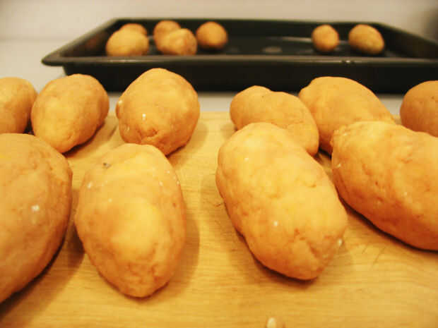 * para saber qué relleno es en que Cepelinas, usted puede rodarlos diferentemente. Por ejemplo que la voy a liar la carne llena como una bola normal y la cuajada o zanahoria unos como un zeppelin. También puede utilizar el pulgar para hacer una muesca en el Cepelinai para marcar un relleno de otro.