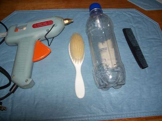 cepillo, peine y tu cabello con un elemento de agua. Empiece por conseguir un cepillo, peine, botella de agua vacía y una pistola de pegamento caliente.