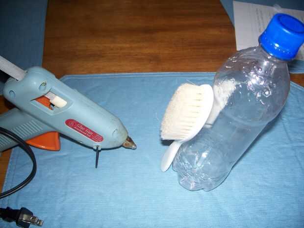 Primero tienes que caliente pegamento en el cepillo a un lado de la botella de agua.