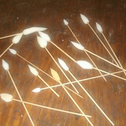 Los materiales utilizados son de espuma de colchón, pinchos de cocina de bambú y un poco de pegamento para mantener la espuma en el palo. Para el pegamento, usé un pegamento de silicón líquido a menudo se encuentran en tiendas de tela o de arte. También se trabajarán otros pegamentos resistentes al agua.