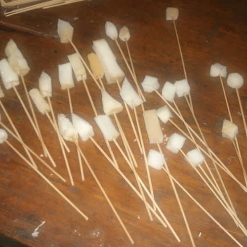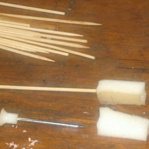 Haga un orificio en las piezas de espuma con una herramienta afilada (Picahielo) y luego insertar el pincho de bambú. Trate de no tener madera de sobresalir de la parte superior del cepillo. Como alternativa, si no te importa tener la punta afilada de la brocheta en el cabezal del cepillo, basta con pulsar el extremo afilado de la vara directamente en la espuma.