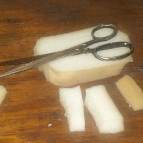 Toma un cuchillo grande (o machete) y cortar la espuma de colchón en las losas. Utilice tijeras para cortar las losas en tiras.