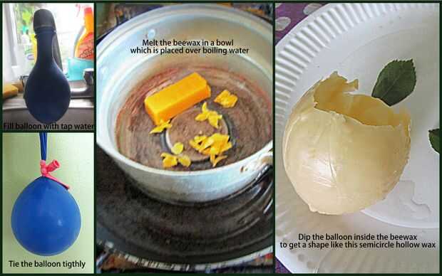 6. Después de cuidadosa capa de la cera de abejas alrededor del globo, liberar el globo para permitir que el agua salga. La cera de abejas final después de quitar el globo parece un hueco semi círculo cera de abejas.