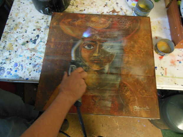 A continuación tome una pistola de calor o soplete de propano y recalentar toda la superficie, es listo aceptar capas posteriores, este proceso se llama encáustica, que es una palabra griega que significa quemar en. Sin fusión de cuidado de la pintura será débil y carecen de integridad. Es muy importante prestar atención a la fusión de cada capa de la pintura cada paso del camino.