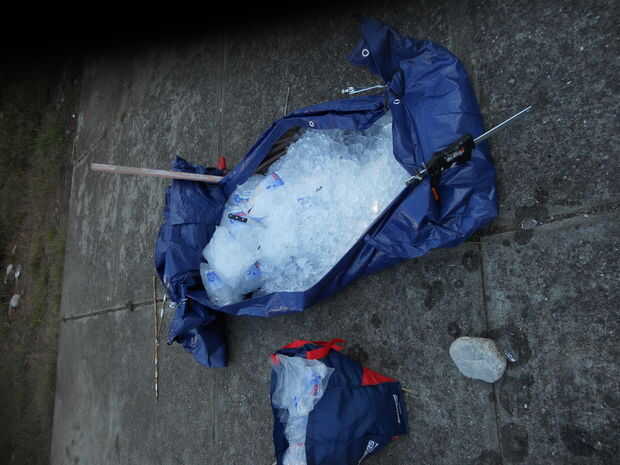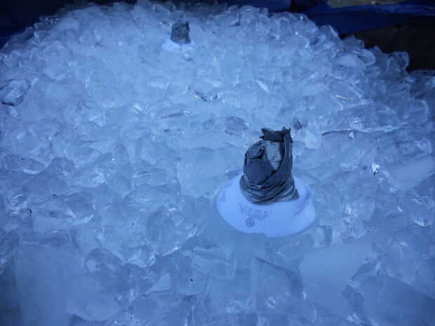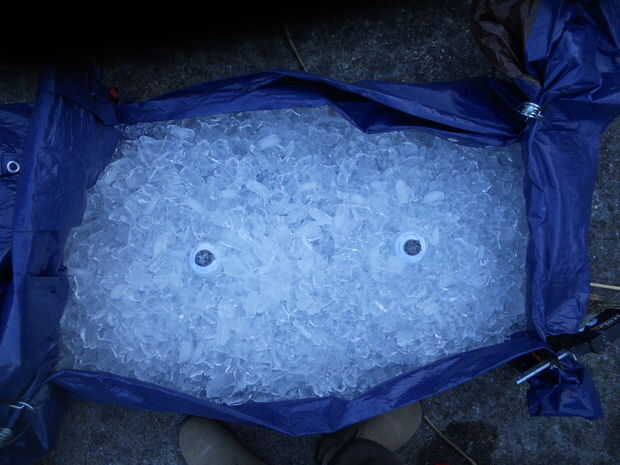 Ahora llenar su lona o recipiente con hielo, me tomó alrededor de 13 bolsas, creo que estaban sobre cada galón. Nivel de la parte superior del hielo y pegan sus bombillas en él. Pongo en para cubrir cerca de 4/5 de la parte de la esfera de la bombilla.
