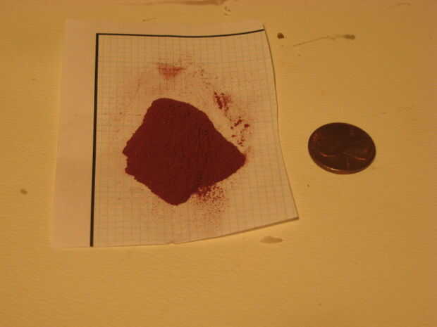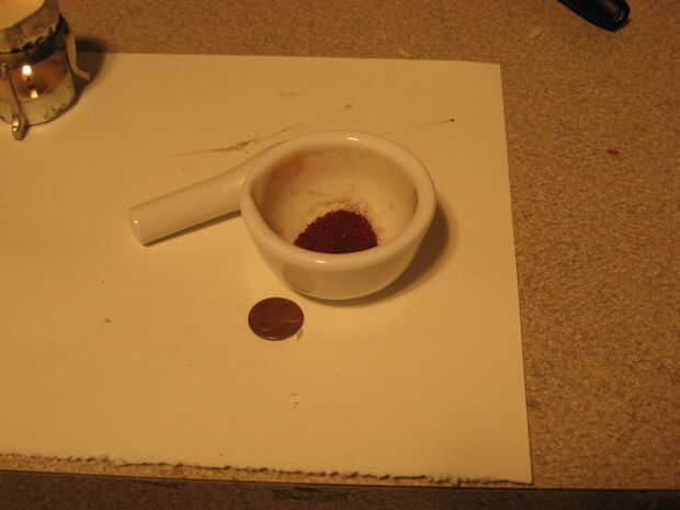 Medir hacia fuera aproximadamente 1/4 cucharita de colorante y moler con el mortero y una maja.