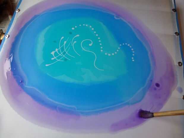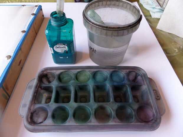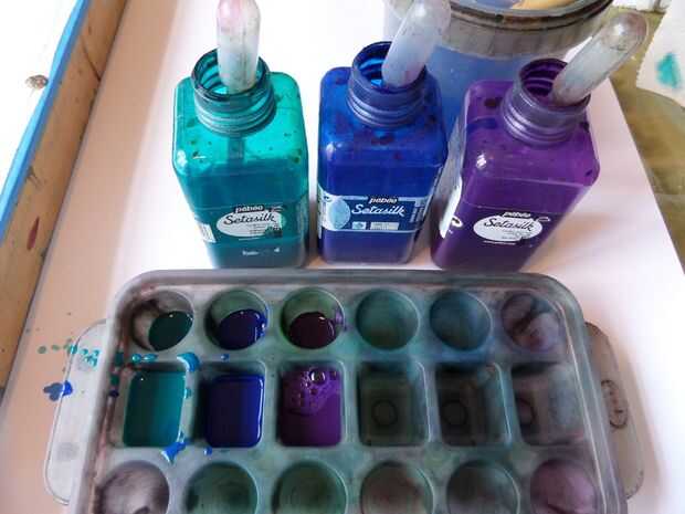 Estoy usando versiones diluidas de color turquesa, azul Gitane y Iris Violeta de la gama de Setasilk de Pebeo como estos colores juntos.
