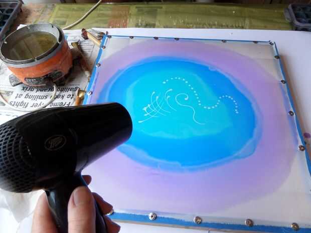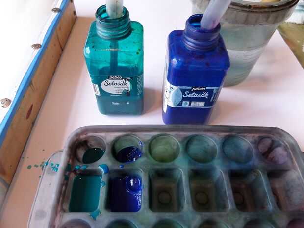 Paso 3: Aplicar fix hierro pinturas de Setasilk de Pebeo - turquesa, azul Gitane y Iris Violeta
