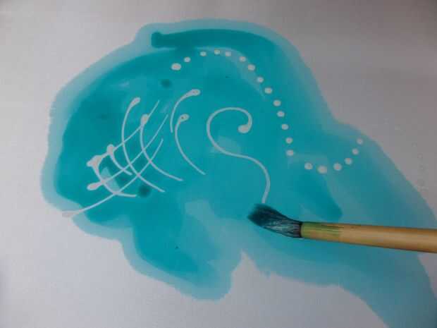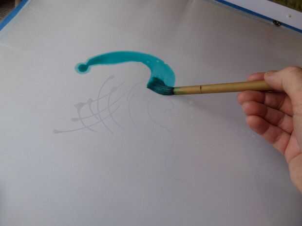 Después de las primeras marcas son hechas en la seda blanca es hora de introducir algún color.