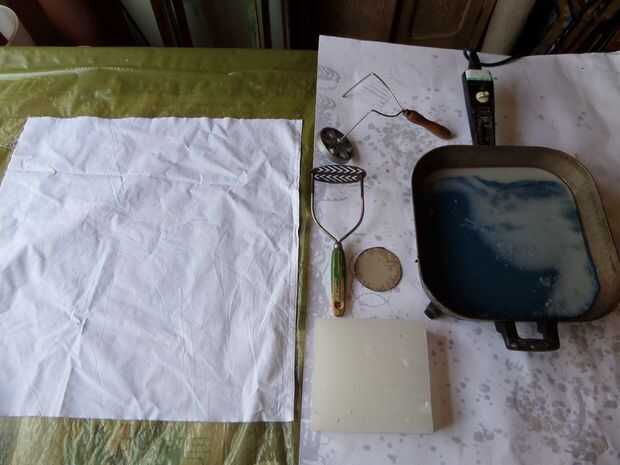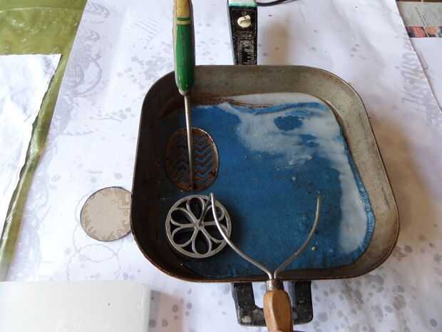Agregó la cera en la olla y esperó a que se caliente para arriba, cuando la cera se ve clara que es el momento de colocar las herramientas que quería utilizar en la bandeja. Espera unos minutos hasta que las herramientas son lo suficientemente calientes, siempre puede comprobar el primer sello de la impresión en algún diario para ver si la cera está buscando claro.