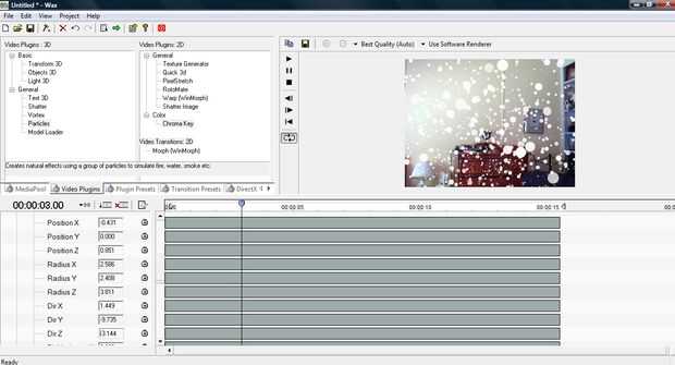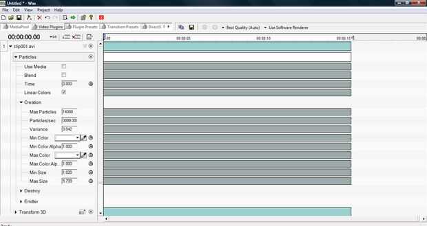 Volver a la pestaña plugins de video en arrastrar partículas en su video clip. En primer lugar si nieve desmarque la casilla "Mezcla" y marque la casilla "Color lineal". Luego en el menú desplegable de creación cambiar todos los colores a blanco y cambiar el tamaño a 1-5 (min-max). Cambiar los colores en el menú de destrucción al blanco también. A continuación mueva el marcador de línea de tiempo a la mitad de tu video y abrir el menú desplegable de emisor y cambie la configuración de la radio para montar el video entero, y el directorio de la "Y" a un número negativo, así los flujos de la nieve, desde entonces todos los ajustes están bien para editar sólo hacen como usted lo desea!