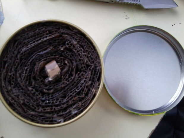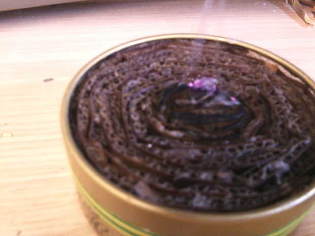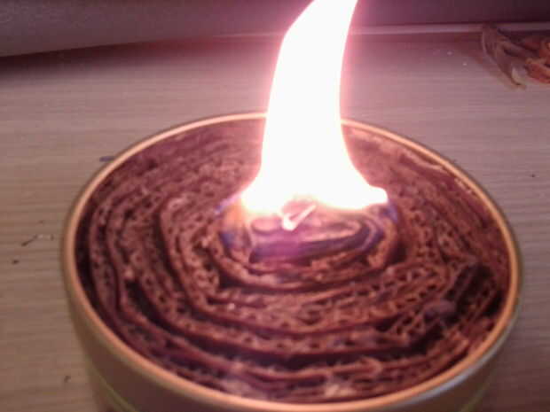 Para hacer rodar la tarjeta alrededor del borde de la lata, espiral alrededor hasta llegar a la mitad, añadimos unos trozos de tarjeta que se pega para arriba para el uso como 'mechas'. Luego encienda una vela o derretir algunos cera y cubierta de la tarjeta en cera, (una capa fina en todas partes funciona mejor y déjelo remojar antes de añadir más)