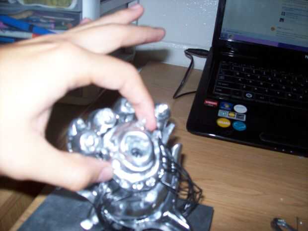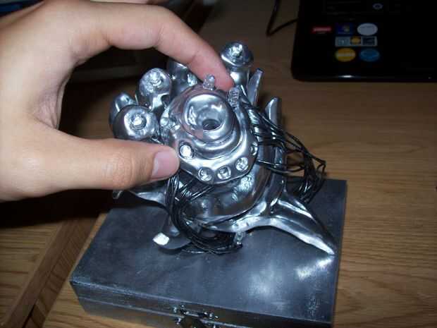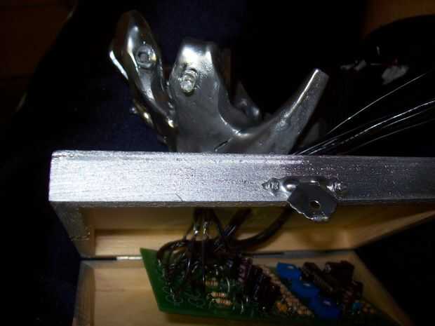 Desarrollo de una estrategia para poner esto juntos fue muy difícil. Hacer agujeros utilizando el cortador de madera en la caja y colocar donde usted tendrá que ejecutar el cable y lo suficientemente grande para que todos los cables pasar a través. Tenga en cuenta que puesto que la pintura de aerosol del cromo, puede alterar la conexión de los cables y LEDs, así que tenga cuidado con algo que proteja la conexión. Comenzar con el soporte de la cerámica, me decidí a poner amarillo se ilumina desde el órgano del color, así que fue donde me encontré los cables primero.