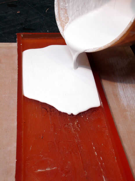 Después de ha vulcanizado caucho, retire de la bandeja y voltee. Quitar cualquier arcilla atrapada con un cepillo de dientes. Rocía con desmoldante y en las grietas con un pincel. Vierta el yeso poco a poco en el molde, a partir de la esquina. Cuando el yeso se endurece, sáquelo del molde de goma y deje que se seque completamente, esto podría tomar varios días. Ahora te queda una impresión negativa del polo original. Si el yeso se aplica directamente al poste, no sería capaz de quitar.