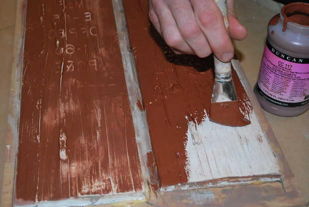 3) Rocíe la superficie con una dosis pesada de agua inmediatamente antes de presionar la arcilla en el yeso. Esto hará que el palo de la arcilla. Espere 30-60 minutos para permitir que bajo el vidriado adherir a la arcilla y retire la losa. Con suerte, sobre todo bajo el vidriado se pegue a la arcilla, pero es normal que se han dejado un poco atrás. Está bien porque peeling obras estéticamente con los postes demacrado que intenta reproducir. Nota: bajo vidriado color debe ser más ligero que el color de la arcilla.