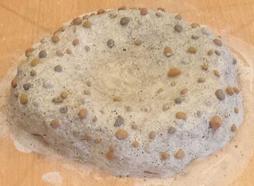Para conseguir las piedras que parezca más realista que mezclé colores bajo vidriado con la arcilla de la escultura. Éstos fueron formados en bolitas y pegados a la arena mientras todo estaba húmedo.