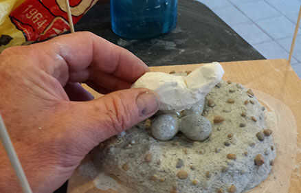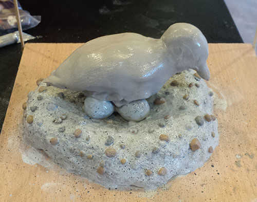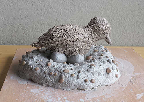 Hacer el pájaro hueco haciendo una forma de papel y cinta adhesiva y agregando una capa de arcilla.