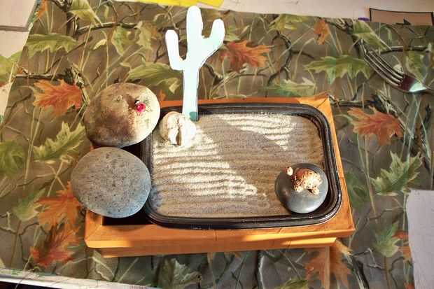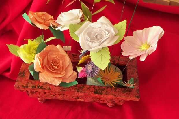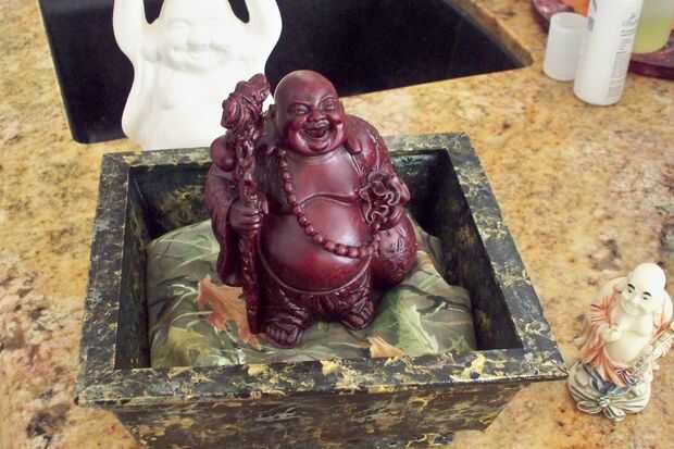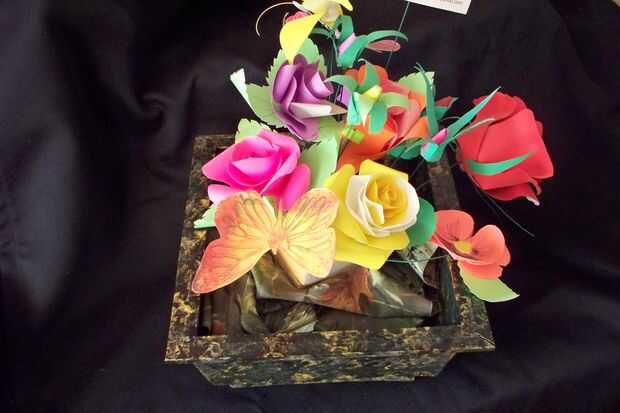 Como se puede ver, utilicé algunas flores de papel como apoyos para mostrar mis jardineras. Estas flores están hechas de papel y deben ser objeto de un futuro instructable.  Pensaba que iría bien con el plantador oscuro un bonzai y o una estatuilla de Buda.  Se ve con un carácter chino para sugerir un tema oriental.