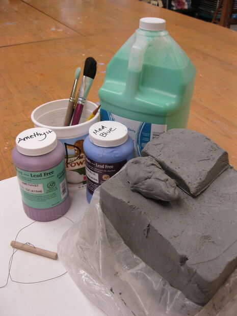 Estos son los suministros para la cerámica gancho parte del proyecto. Arcilla (usé blanco grog, bajo fuego) lápiz cortador de arcilla underglazes y claro sobre esmalte. cepillos acceso a un horno.