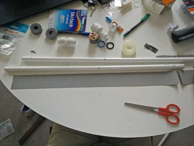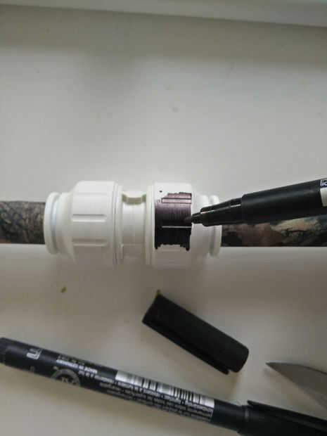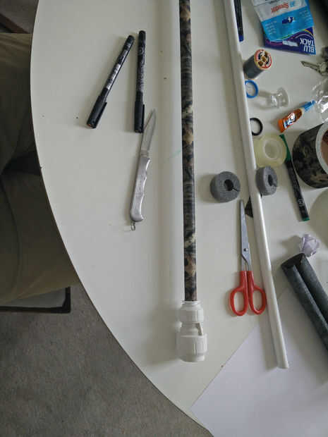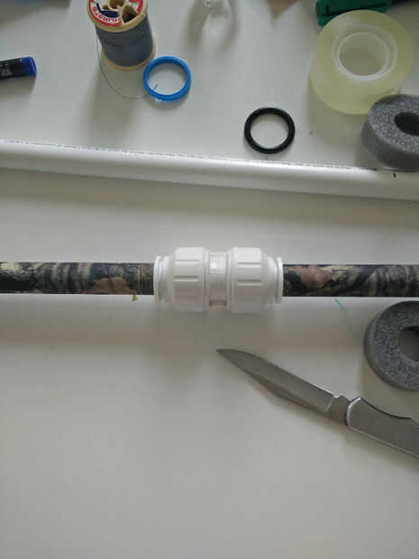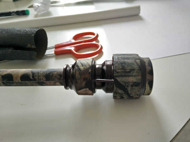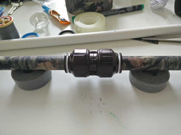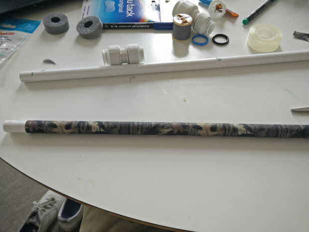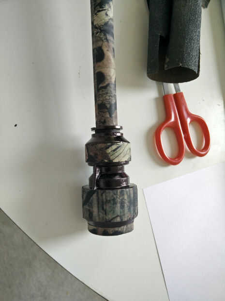 En las dos piezas de tubería, marcó la posición de la conexión y la boquilla y cortado a la medida de un pedazo de cinta adhesiva de camuflaje lujo para darle un mejor aspecto. Me puso el pedazo de cinta sobre la mesa y envuelto cuidadosamente el tubo, teniendo cuidado de no superponerse con el conector y la boquilla. Pinté el adaptador medio negro con un marcador permanente (también puede usar pintura de aerosol) y la boquilla negra y cinta adhesiva.