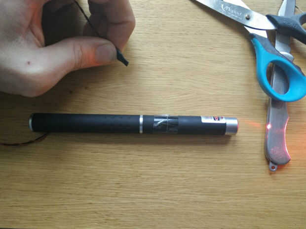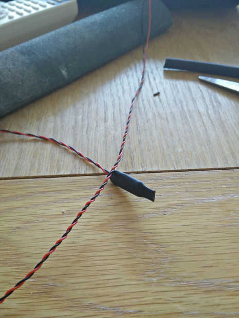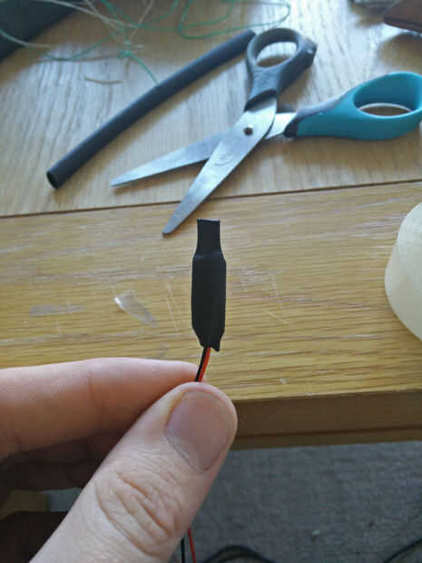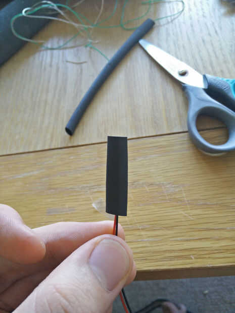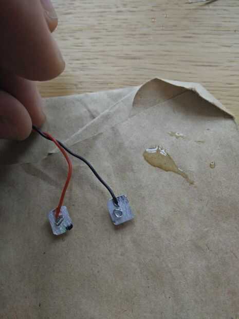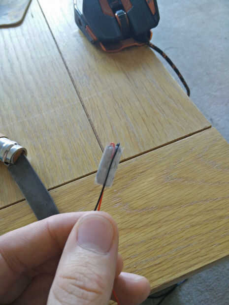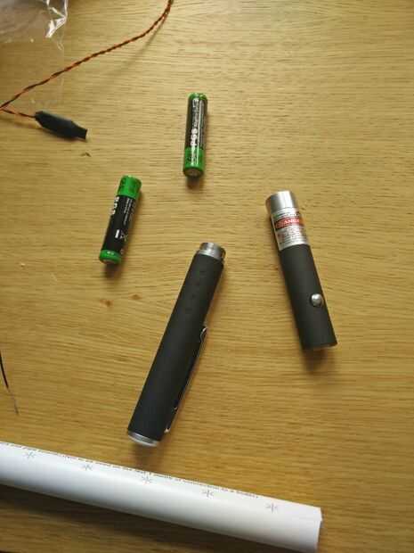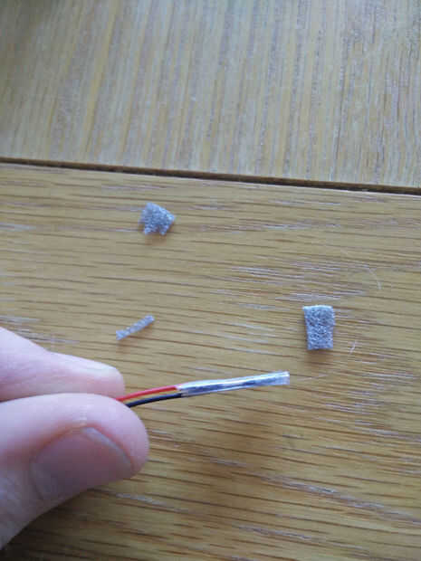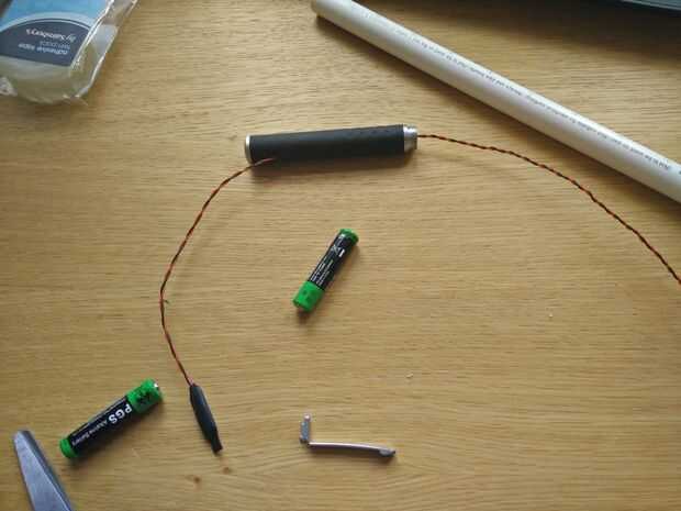 Quería que el láser lo más cerca al final de la cerbatana como sea posible, pero no quería tener que alcanzar para con mi mano así que decidí hacer un control remoto colocado presión interruptor. Simplemente corté dos rectángulos pequeños de aluminio de una lata de bebida, arena a ambos lados para retirar la resina y hacer contacto eléctrico posible. Luego graba un pedazo de alambre eléctrico USB en cada uno de ellos y hacen un sandwich con las dos placas separadas por dos pequeños pedacitos de espuma para crear una conexión eléctrica cuando se aprieta. Sujeta todo con un poco de cinta regular, luego dobla a los cables al revés para que no suelte si tiré accidentalmente. I montar el interruptor en un pedazo de tubería encogible para hacerla más resistente y había trenzado el cable. Encogi los tubos en los extremos pero no en el medio como hacer tan podría presionar el interruptor para siempre.