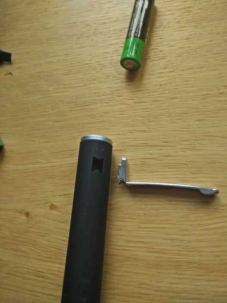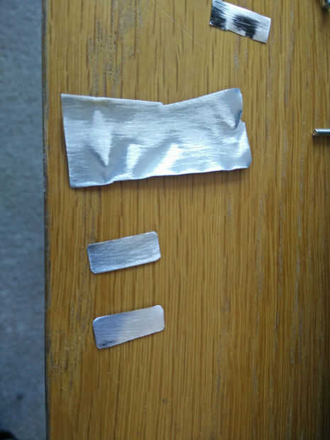 Entonces hice un "break" para la corriente dentro del compartimento de la batería así que pude evitar jugar con el interruptor existente, que habría sido un dolor sin soldadura de hierro y alambre. Lo hice para que mantendría el conmutador regular apretado con un trozo de cinta y sólo necesita apretar el interruptor de presión para conseguir un láser de haz. Esta rotura consiste en dos pastillas de aluminio, separadas por un trozo de material aislante. Uno de ellos toca un poste de la batería y el otro el cuerpo que actúa como conductor entre la batería y el módulo de láser.