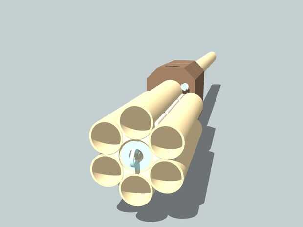 Como el pegamento caliente es todos en los rincones entre los tubos, el toque final es tener una banda de caucho a través del tubo central, 2 juntas tóricas atrás y una placa y un anillo en la parte delantera, para hacer que el cilindro gire, mientras está conectado a la cerbatana.