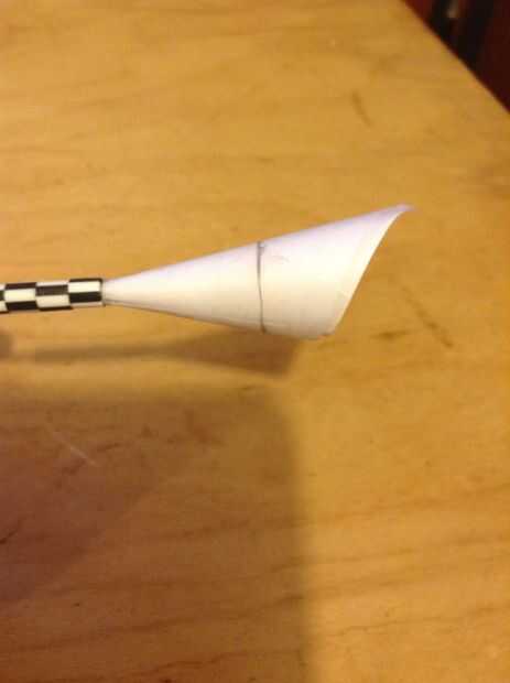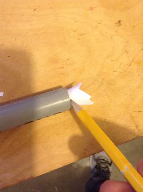 Luego descansar el dardo en la pipa del PVC y la traza donde se unen el cono y el tubo. Quite el dardo y corte a lo largo de esta línea. Prueba de que el dardo se ajusta perfectamente en el tubo. Usted no desea que tenga un montón de movimiento, pero debe has tienes que meter ahí tampoco.