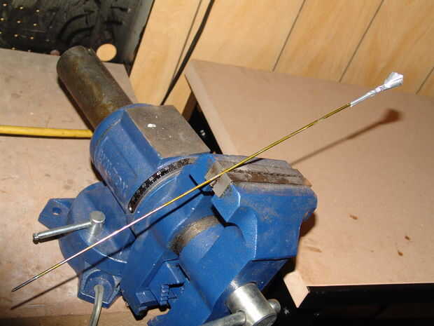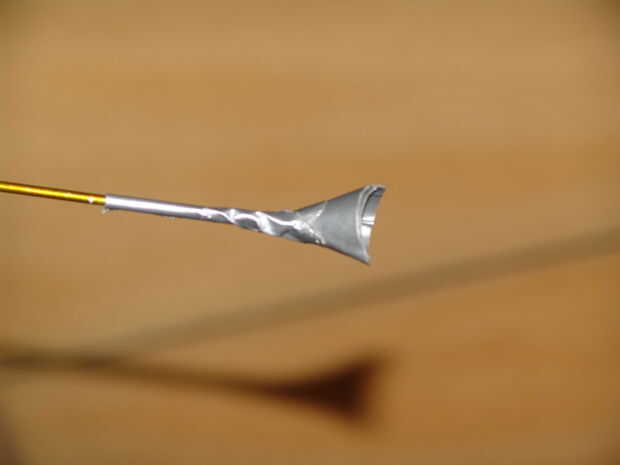 Ahora necesitas algo para tirar. Dardos de madera o de bambú están bien, pero debido a su baja densidad y masa no pueden volar tan lejos como acero ni penetrar tan profundo. Por lo tanto, te recomiendo que de una percha de alambre de todos usted recortar el tramo recto medio que es cerca de 15" largo para utilizarlo como un dardo. Luego, realizar un cono (quizás más uno que está en la foto!) de la cinta que se ajusta alrededor del dardo. Coloque el cono en el conducto y marcar con un rotulador donde encuentra. Corte en o más allá de esta línea para hacer un cono de tamaño adecuado. Deslice este y fije con una generosa cantidad de cinta adhesiva (como se muestra en la foto). Este cono se tanto coger el aire que propulsa el dardo y estabilizar el dardo durante el vuelo. En un molinillo o con papel de lija o el archivo, Esmerile la punta del dardo a un punto agudo.