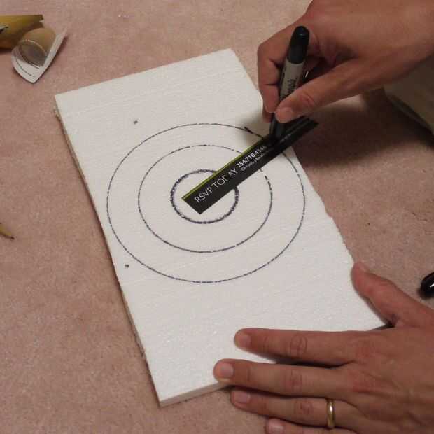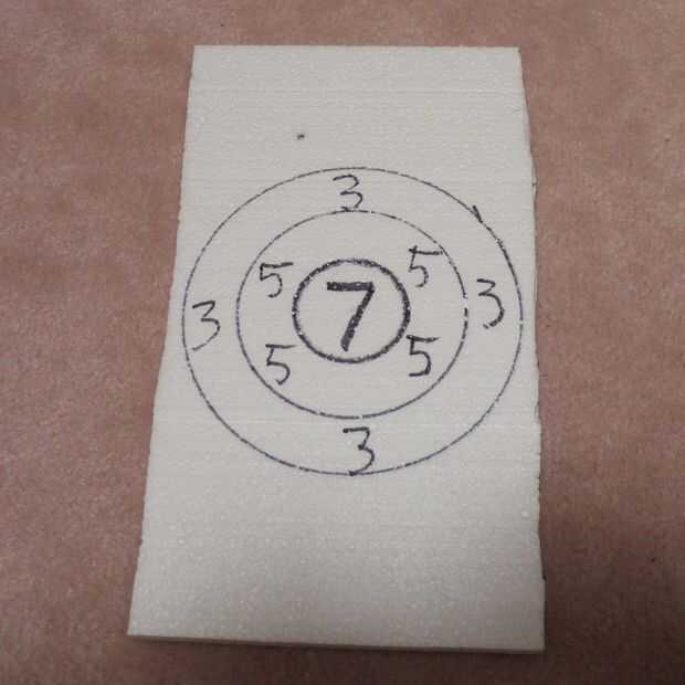 Pegar la cartulina en el destino del centro con un alfiler, clavo o palillo de dientes, a través del primer agujero. Con un rotulador permanente en cada uno de los tres agujeros, dibujar tres círculos, con diámetros de 6 cm, 12 cm y 18 cm respectivamente. Marque los valores del punto para las regiones: 7, 5 y 3.