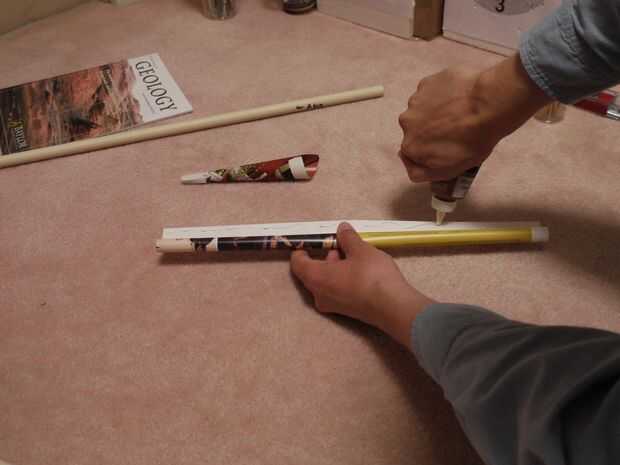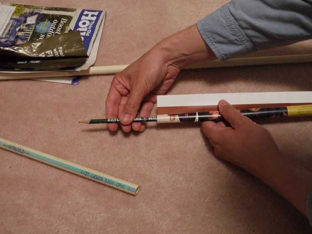 Pero no puede tener un objeto tubular en su oficina. Lo que se puede utilizar en su lugar es que un lápiz con una goma elástica enrollado varias veces alrededor de la goma de borrar. Se trata de una herramienta que será crucial para la fabricación de dardos, también. Hacer un gran tubo áspero de la doble página, y entonces el lápiz dentro de en un extremo, mientras presiona contra la parte interior del borde para endurecer ese fin algo y luego repetir en el otro extremo, hasta que el diámetro interior es satisfactorio. Nota: No está envolviendo el periódico alrededor del lápiz - que haría demasiado estrecho un tubo--pero simplemente utilizan el lápiz para apretar el rodillo.