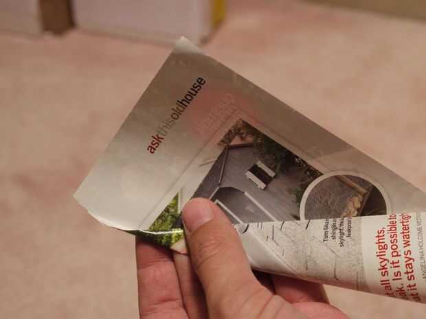 Suavemente la página con una mano cerca de la curva, inserte un dedo o el pulgar dentro de la porción agachado y rodar un poco en un cono áspero, dejando una gran aleta suelta, como en la segunda foto.