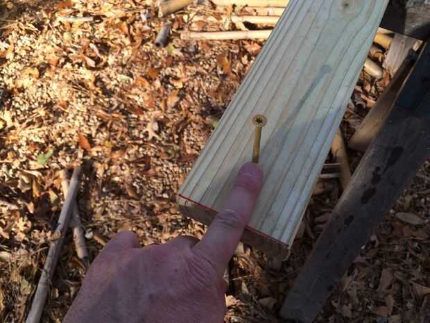 Escoger un lado y poner un tornillo en ambos largueros de ese lado. Escogí la izquierda porque el suelo naturalmente había inclinado forma un poco. Mi dedo es mi herramienta de medición para mantener dos tornillos a la misma distancia