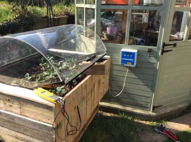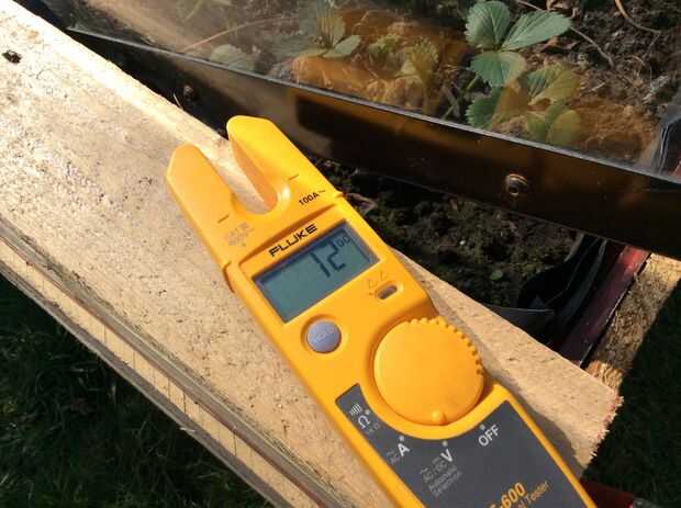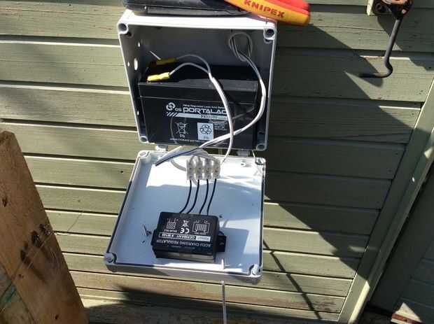 Usé una caja impermeable (recinto) de lavaplatos comercial para el kit eléctrico de la casa. La fuente de alimentación es una celda de 12v de una luz de señal de emergencia. Esto se mantiene cargado con un panel solar del picovoltio que se une dentro del invernadero.