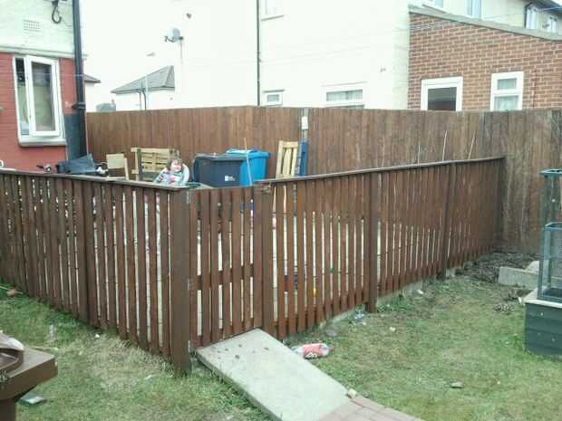luego se une la madera de los palets mediante un bloque como un espaciador y con algunas mejores para detener la lluvia en la veta sino también para que se vea mejor y con tinción con algún oscuro roble Ronseal una capa Fencelife.