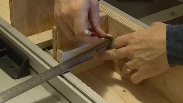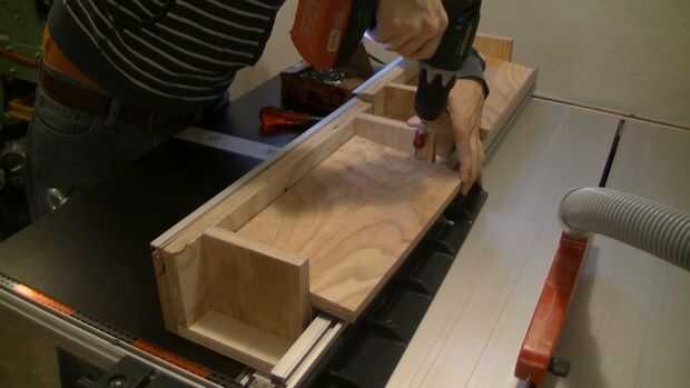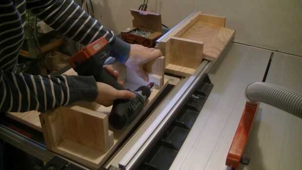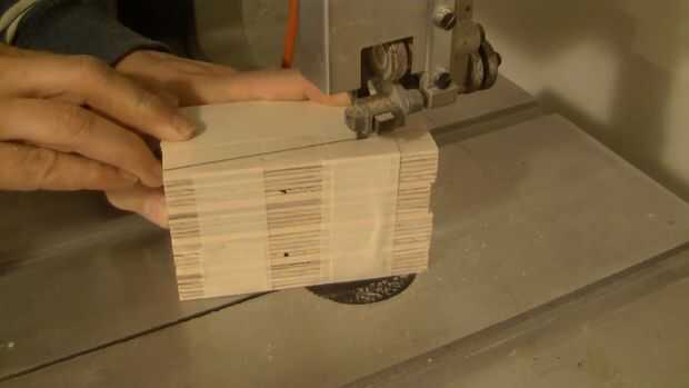 El ángulo de los bloques de soporte se toma directamente de la pieza de trabajo. Entonces estoy apilando los cuatro de ellos junto con cinta de pintor y corte en la Sierra de cinta. Entonces es tiempo para taladrar y atornillar.