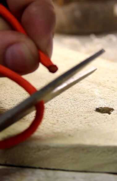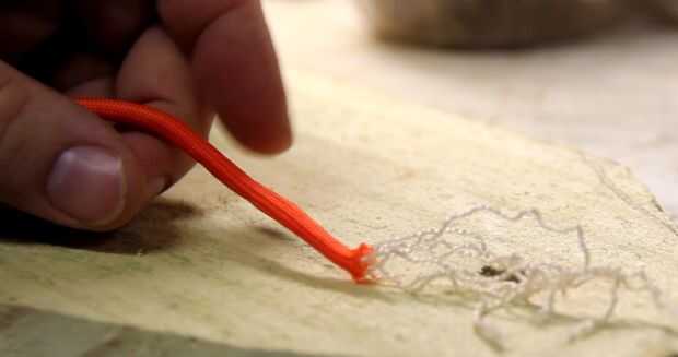 Ahora he utilizado paracord y cierta cuerda encerada, rescatado en dos de estas bolsas. Para el paracord, recomiendo derretir los extremos antes de trabajar con él. Esto mantendrá la base de sacar y dejar de fray. Se puede ver en las fotos donde quiero Presione el extremo fundido de paracord contra algo metálico, generalmente las tijeras he cortado el cable con. Esto funciona mejor para mí mantener ordenado el final.