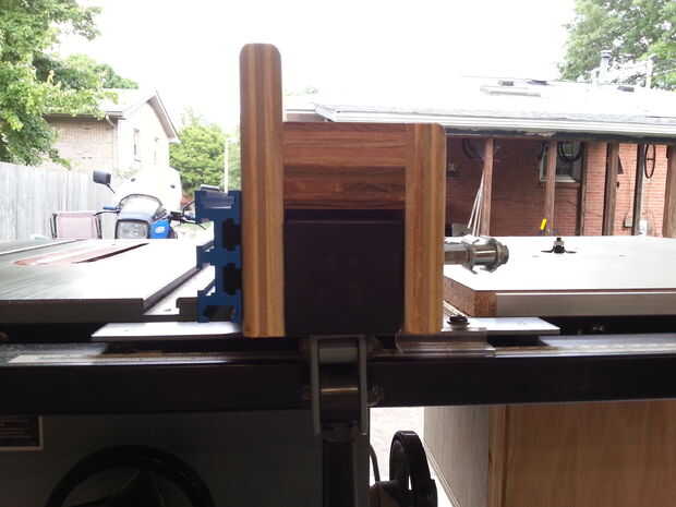 Decidí hacer el lado derecho para que cuando la pieza de arriba se sujeta la parte superior sería con él y la parte inferior de la pieza superior sería clara la guía por aproximadamente 1/8". Puesto que mi sierra de mesa cerca de 2" de altura, esto significó que corté la cerca derecha para ser 2" + 1-1/2 "+ 1/8" altura = 2-5/8" x 27" de largo alto.