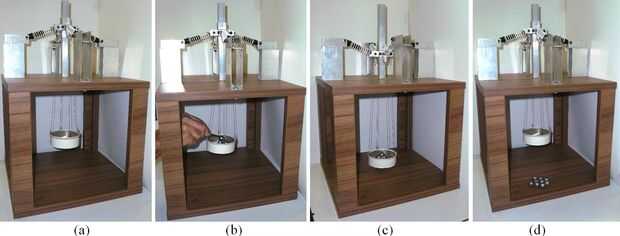Después el complemento a través del sistema, estudiantes pesan las pesas en la escala, como podemos ver en la figura 14. Pesos pesan 332g. También debemos tener en cuenta el peso de una taza, que es 13g. La fuerza crítica de un sistema a través de snap es 3.45 N, que es de 0.004 N superior a la fuerza crítica de experimento.