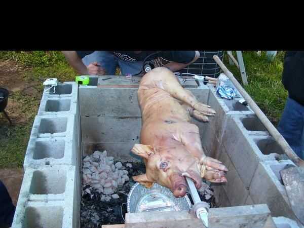 Construcción del hoyo se debe hacer un par de días antes de la cocción. Un lugar de nivel para el hoyo es una necesidad puesto que los bloques simplemente se apilarán, no mortored; mientras tu no más que una burbuja de cuarto nivel sobre 4 pies, usted debe ser fino. Utilice bloques de 10 por fila, 3 filas de alto. Ver la imagen un ejemplo de cómo puede organizar los bloques. Su hoyo no debe ser demasiado largo, asegúrese de que al menos 6" del tubo Al descansa en cada extremo de la fosa. Si construyes sobre hierba, asegúrese de quitar todas las hierbas y raíces de la parte inferior. Quema de hierba le dará al cerdo un mal sabor. Además, no se construyen sobre asfalto,