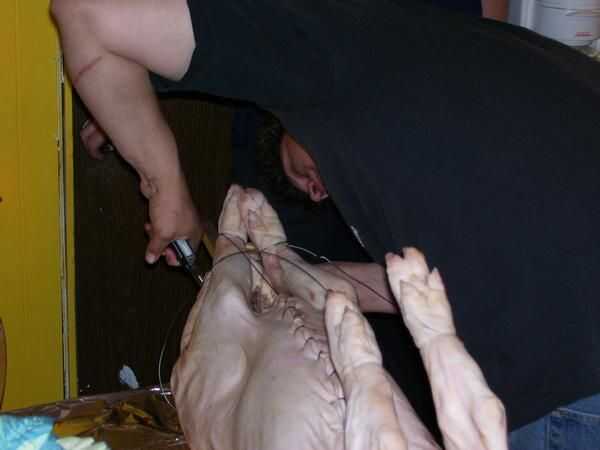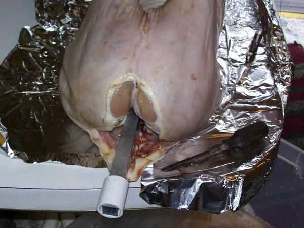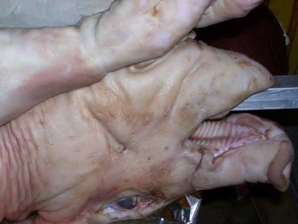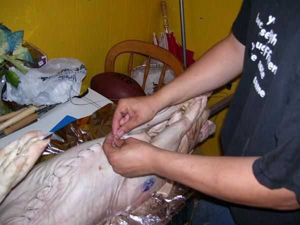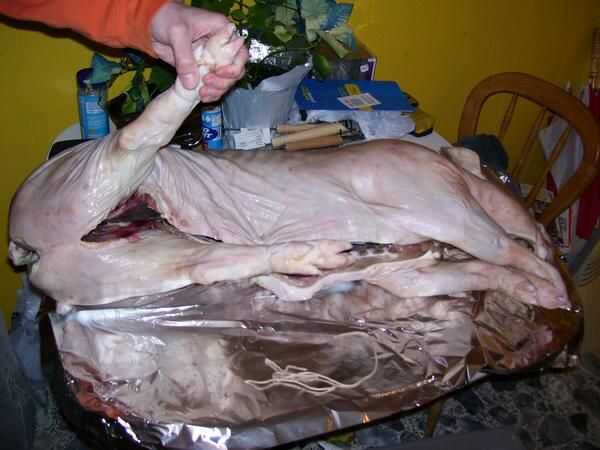 La salmuera no es un paso necesario, aunque puede ayudar el proceso de cocción y por supuesto, añadir sabor. Una salmuera agrega un poco más de humedad a su cerdo y por lo tanto hace menos de una oportunidad de grabarlo. Poner el cerdo en el recipiente de plástico y echar un par bolsas de hielo y llene con agua hasta cubrir. Se trata de una salmuera simple de sólo agua y sal, puede que sea más fácil de disolver la sal en agua tibia primero y luego agregar a la salmuera. De cualquier manera, puede tomar varias tazas de sal para llegar a la brininess adecuada. El agua es pesado y así es el cerdo, quiere sentarse a Tina y todo en una bañera para la facilidad de verter el agua hacia fuera más adelante. Deje reposar en la noche excesiva de salmuera. Al día siguiente debería ser día de cocinero, y que debe levantarse temprano si no planeas cocinar en horas de la madrugada. Drene la salmuera y conseguir su cerdo sobre una mesa cubierta con plástico. Como con cualquier carne cruda, el saneamiento es importante. Puede que desee configurar fuera para que sean jugos del cerdo no goteo todo su cocina. En cualquier caso que desee anexar la saliva primero. Alinee la varilla para que el cerdo es un centro muerto, marque y perfore los agujeros para que alinee detrás de los hombros y las caderas. Introduzca el espetón a través de la boca de los cerdos y su parte trasera; Esto será fácil de hacer, cerdos comerciales se separó de su barbilla chinny chin todo hacia abajo... todo el camino. Realizar los orificios sentarse por lo que se enfrentan a los lados del cerdo. Obtener la aguja muy grande, alicates y alambre de acero inoxidable imagen. Pase el hilo en la aguja, luego, usando las pinzas, empuje la aguja a través del cerdo hacia atrás desde el interior está cerca de la columna vertebral. Tirar un cable a través de y volver al otro lado de la columna vertebral. 24" del alambre para el frente y la espalda debe estar bien. Ahora tire del cable hasta que es uniforme y debe tener un bucle sobre la columna vertebral con los extremos saliendo del cerdo de split. Vuelva a introducir ambos extremos a través del orificio delantero en su barra, a través de la izquierda, a través del derecho. Tome el extremo con la aguja y vaya sobre la columna vertebral y a través del agujero varias veces, luego repetir con el extremo suelto. Deje suficiente cable para que los extremos pueden ser torcidos apretadamente juntos para asegurar el cerdo. Hacer lo mismo para el otro orificio en la varilla. Esto tiene su cerdo en su lugar y evita que resbale durante el rodaje. Una vez fijado el espetón, condimento va. Como usted sabe esto puede tomar muchas formas, por lo tanto la temporada como mejor parezca; Recuerde sin embargo carne grande toma gran condimento, usa liberalmente. El cerdo en la foto tenía un puñado de granos de pimienta, sal condimentada y limones que fueron cortadas por la mitad, junto con un bulbo de ajo, pelado. Después de sazonar, la bestia debe estar cerrada para evitar que las preciosas especias y jugos escapen. Utilice el SS alambre, aguja, pinzas y exceso mano puntada hacia abajo, asegurándose de no ir demasiado poco, o cuando se cocina el cerdo, que encoge se rasgar hacia fuera. Los pies tienen que ser atado para arriba también. Para las patas delanteras, envuélvalas firmemente con el alambre y, a continuación, envuelva el alambre sobre el asador como el cerdo lo sostiene con su boca, torcedura o lazo para asegurar. Para los pies traseros, atar juntos de forma segura y utilice su aguja con puntadas en el vientre. Todo el cableado debe ser muy apretado, el cerdo se reducirá mucho al cocinar.